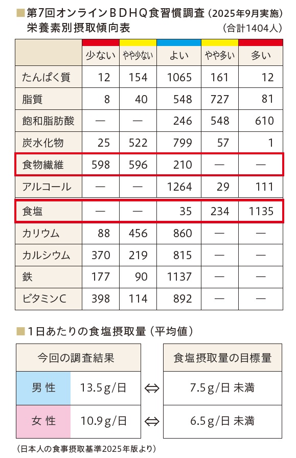 これまでにBDHQ調査にご協力いただいた方の結果から、「食塩の摂りすぎ」と「食物繊維不足」の傾向が明確になりました。
